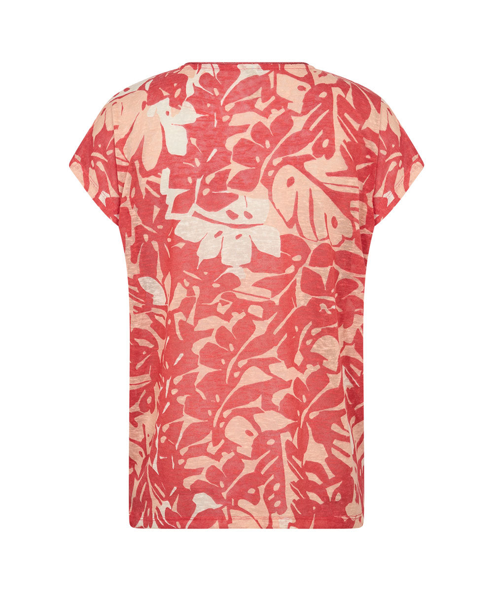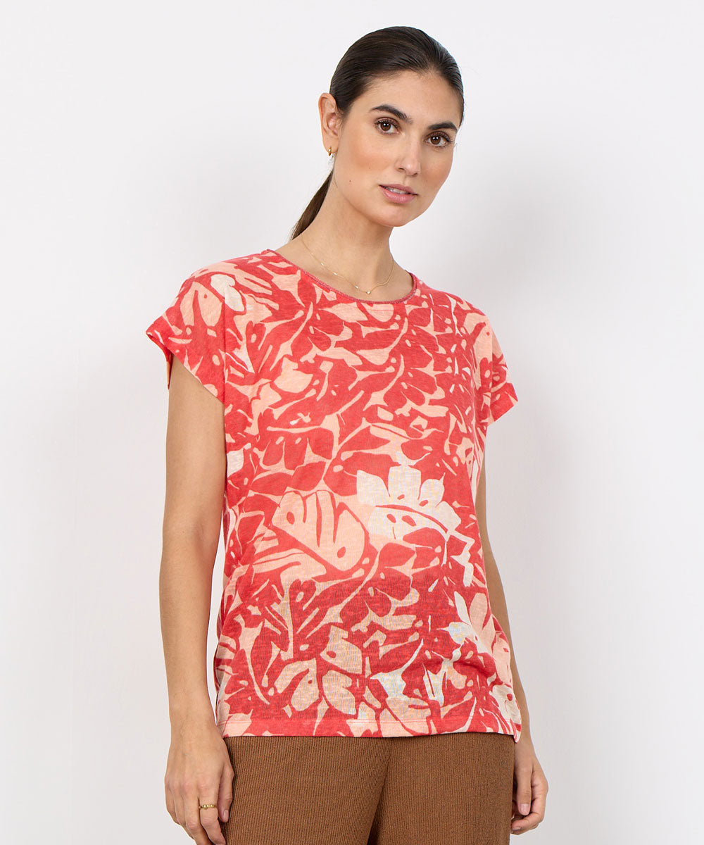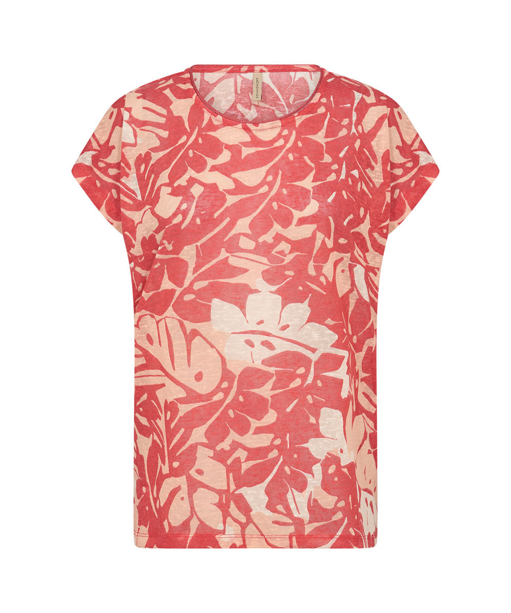 ARETHA 46 är en fin röd T-shirt från Soyaconcept. T-shirten har en rund halsringning, korta ärmar och ett djärvt bladtryck som ger en konstnärlig touch. Rak enkel passform.