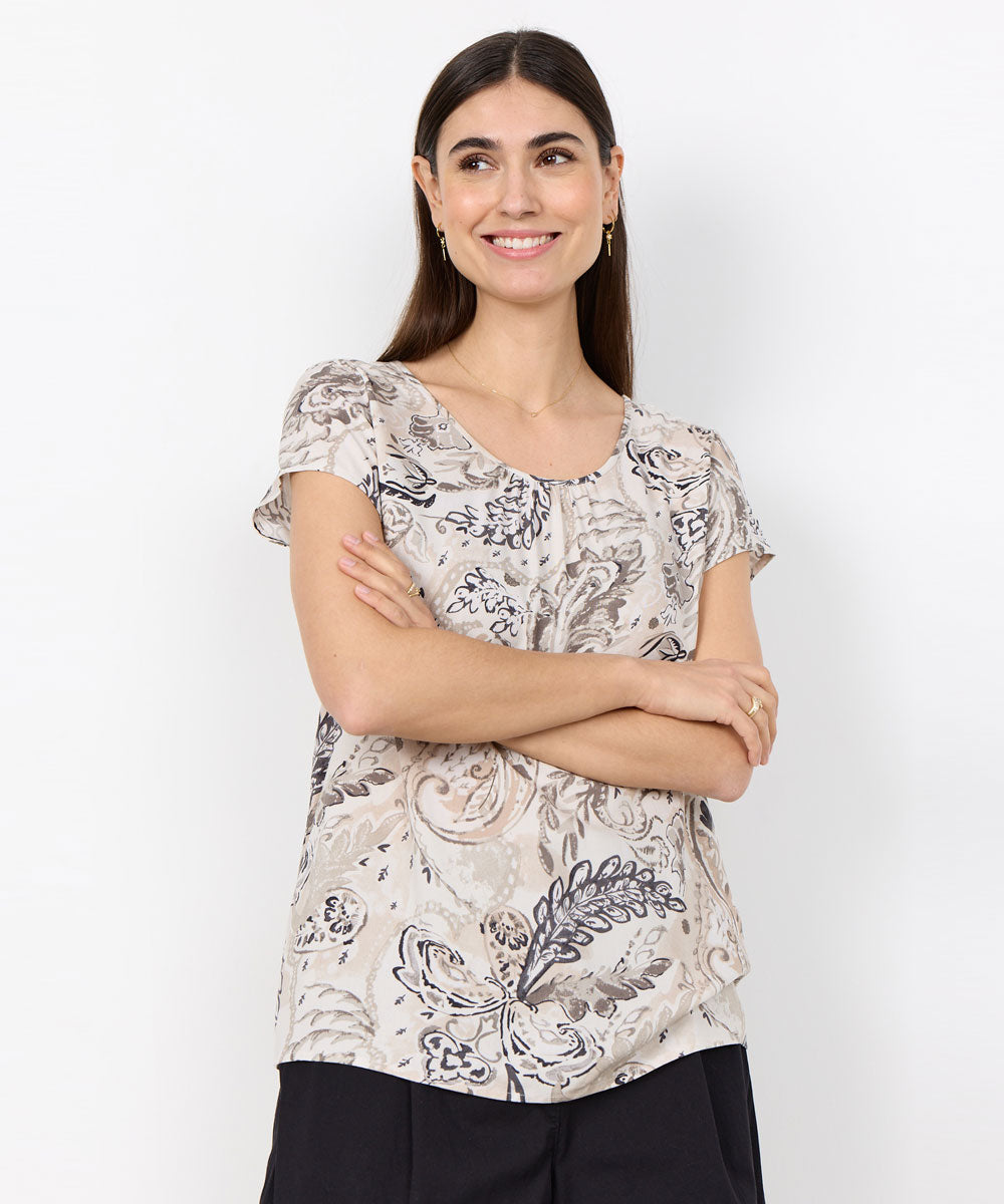 FANETH 2 är en fin mönstrad blus i sandfärg från Soyaconcept. Blusen har en elegant rund halsringning, korta ärmar och ett vackert paisleymönster. Normal passform.
