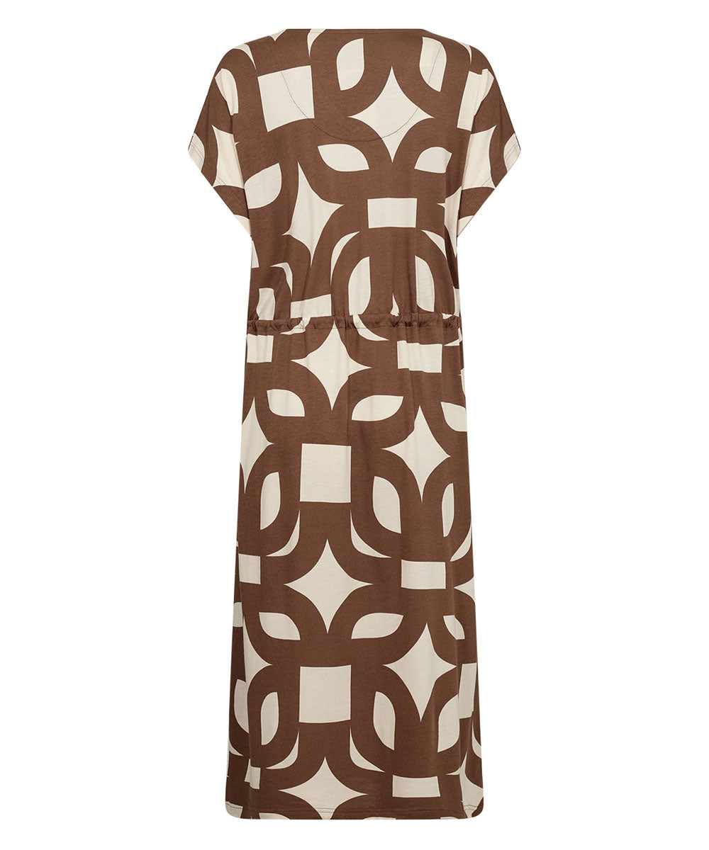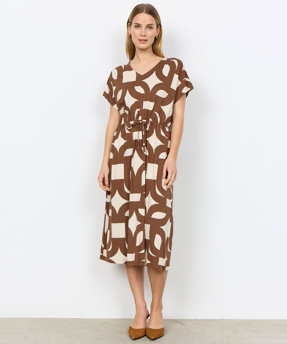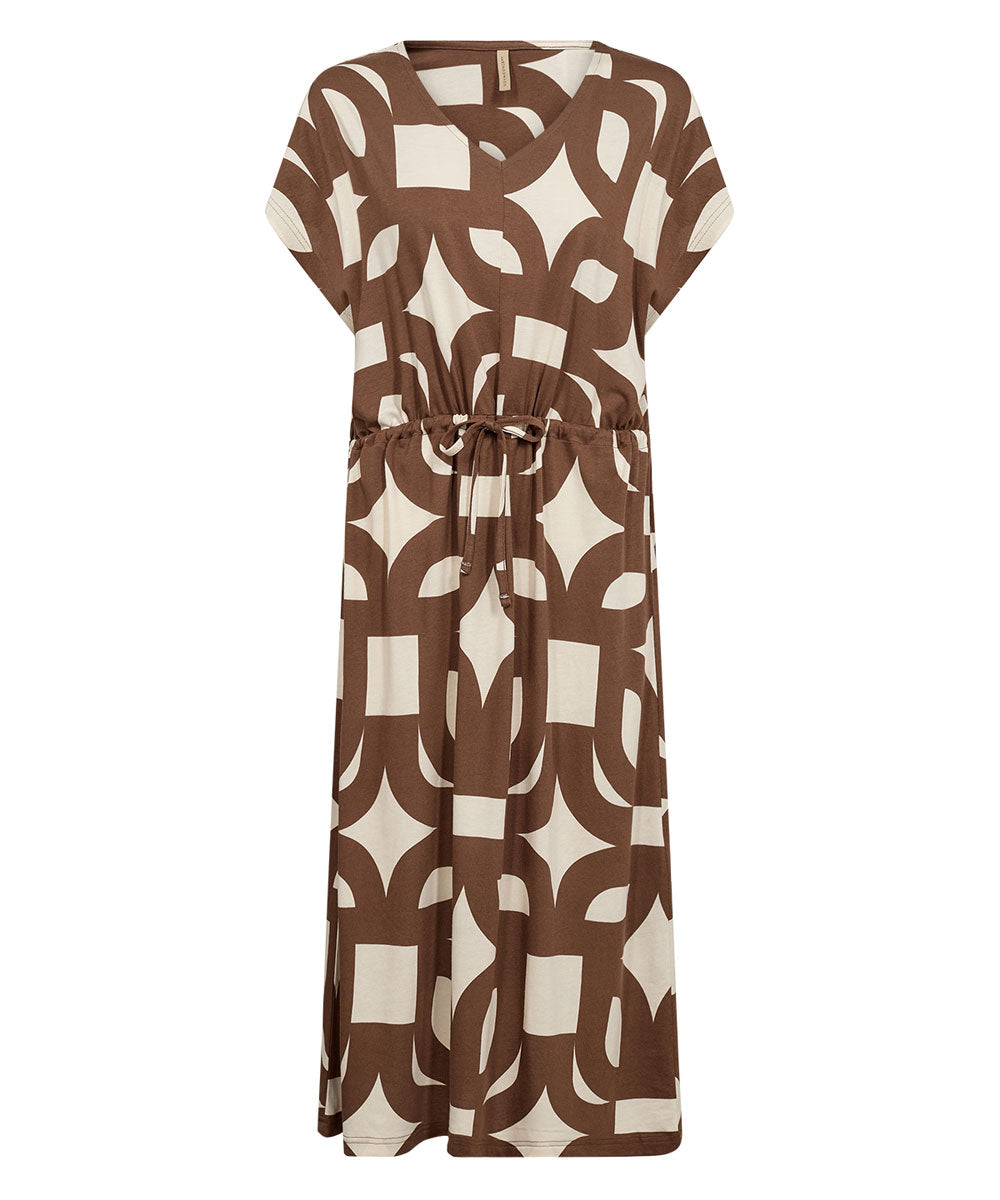 FELICITY AOP 543 är en skön klänning i brunt och vitt från Soyaconcept. Klänningen har V-ringning, korta ärmar, knytband i midjan och ett fint geometriskt all-over-print med en avslappnad passform.