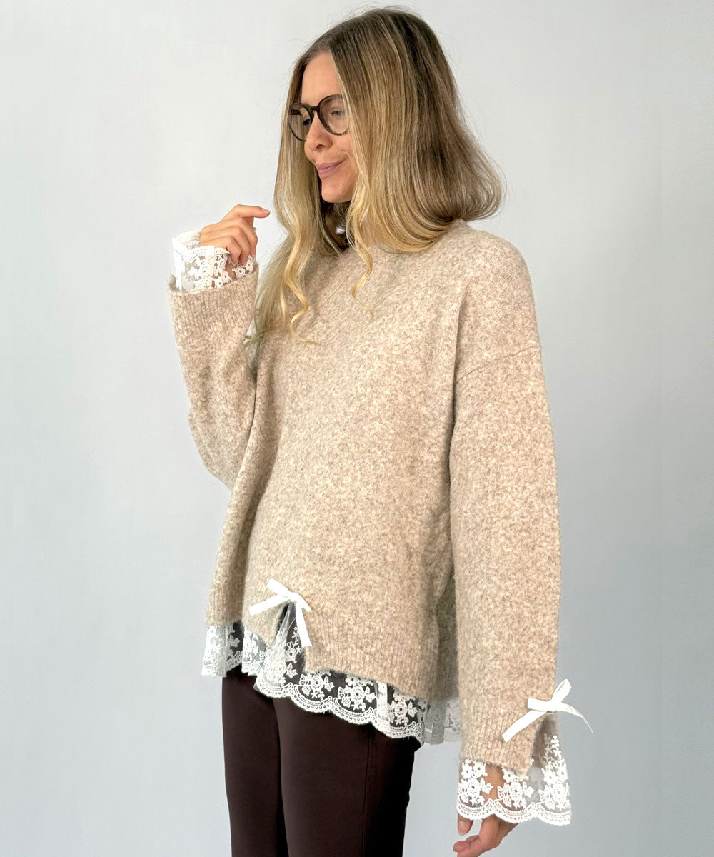 Härlig stickad tröja med spetsdetaljer från Chica London. Tröjan har rund halsringning, långa ärmar och en rak enkel passform. Fina detaljer med spets och rosetter vid ärmsluten och nertill.