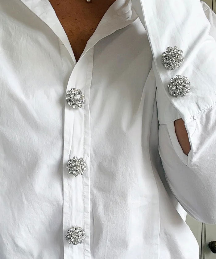 Olivia är ett vackert knappsmycke från The Shoelace Brand. Detta knappsmycke är blomformat med silverbas och klara kristaller som glittrar som små diamanter. Använd detta smycke till att piffa upp en skjorta, kofta eller jacka. Lätta att fästa och ta bort.