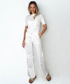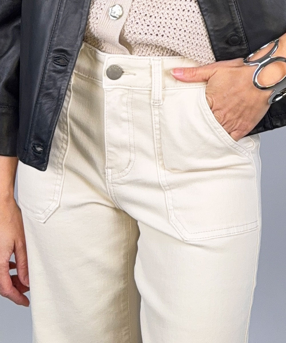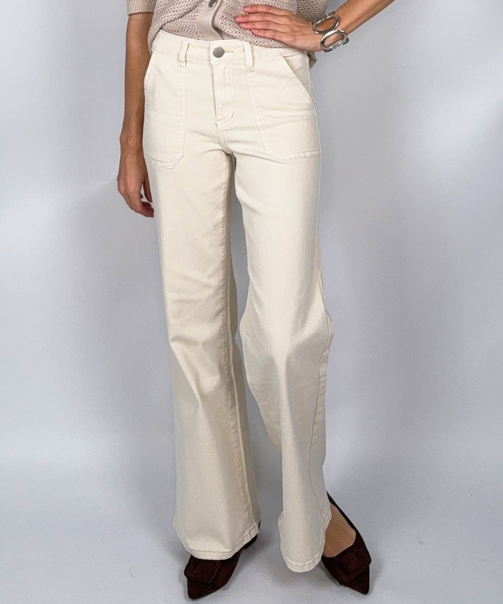 Snygga Toxik jeans i en ljus beige färg. Jeansen har hög midja, utanpåfickor framtill, fickor bak och långa vida ben. Sköna jeans med stretch.