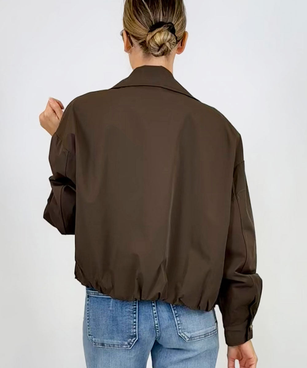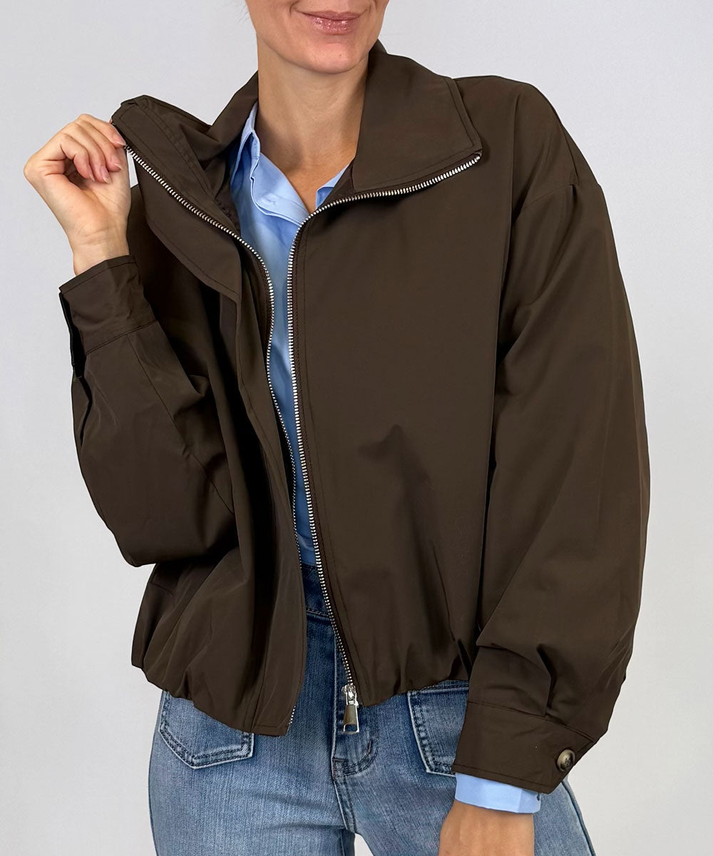Blanka är en snygg jacka i bomberstil från Ezence. Jackan har en hög krage, dragkedja framtill, fickor i sidorna och långa ärmar med knapp vid ärmsluten.