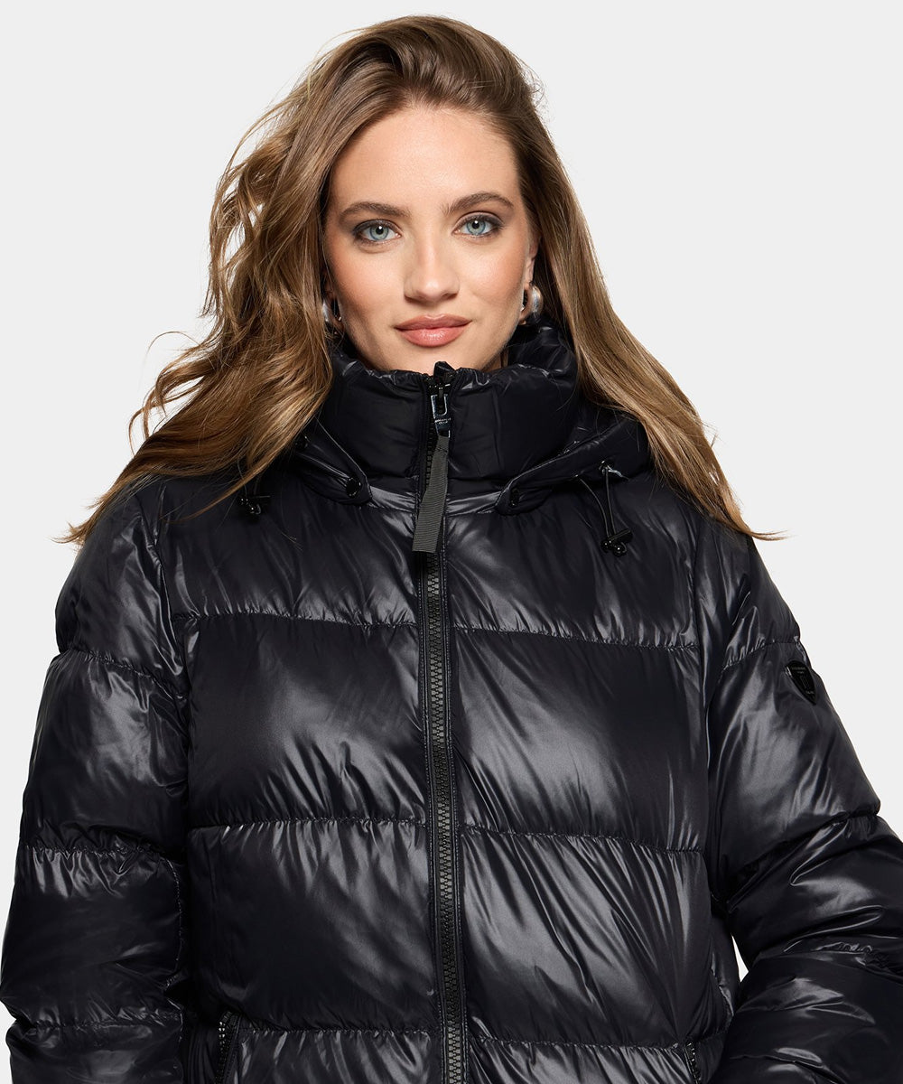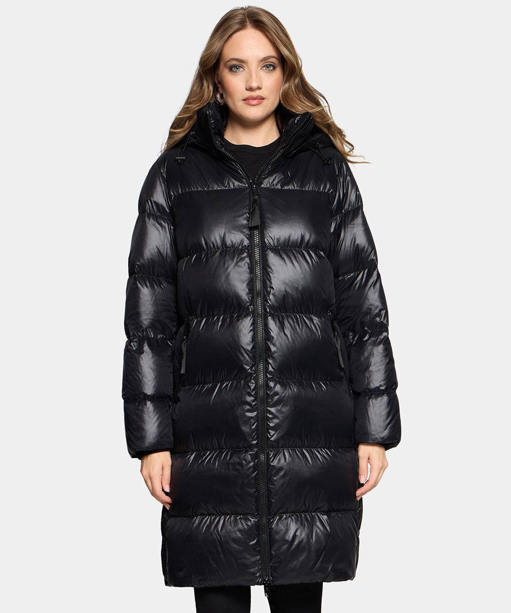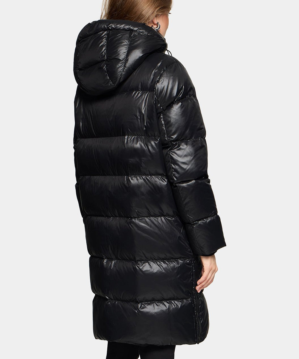 Camila är en lång och vadderad dunkappa i glansigt tyg från Rockandblue. Kappan har en avslappnad stil med sportig silhuett. Genomtänkta detaljer i form av sneda framfickor med knappstängning, en elegant dragkedja fram, hög krage, mysig huva med dragsko, ribbstickade manschetter och sidoslitsar med knappar för extra flexibilitet.