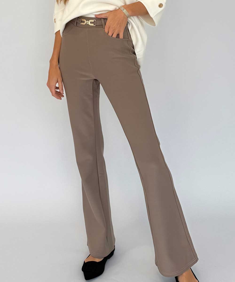Superhärlig stretch byxa från Chica London. Byxorna här en dra-på-modell med fickor fram, hellånga utsvängda ben och ett fint guldspänne i midjan.