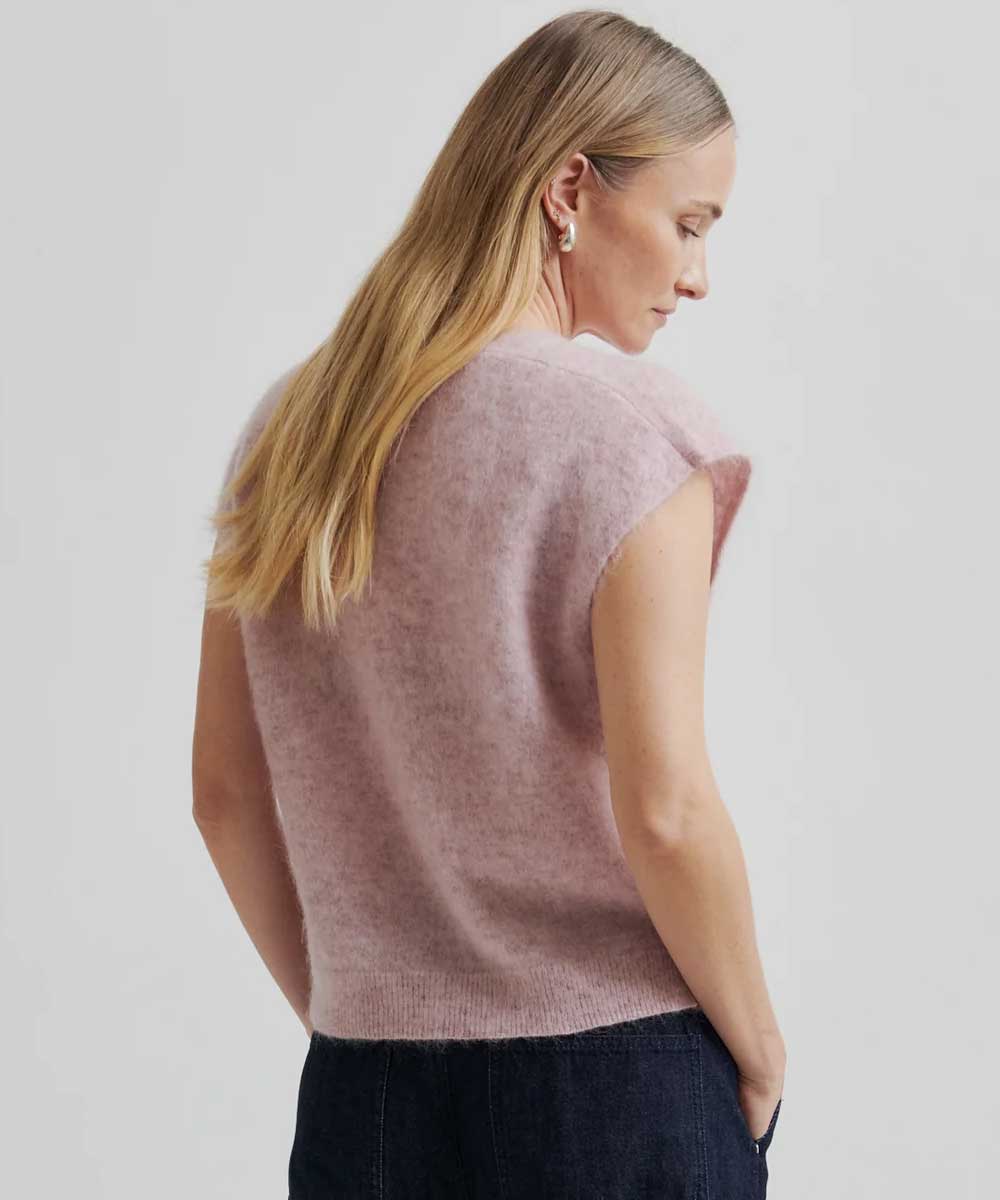 Camryn är en härlig fluffig stickad väst från Second Female. Västen är gjord i en mjuk och stretchig mohairblandning, har v-ringning och ribbad nederkant med små slitsar i sidorna. Avslappnad skön passform.