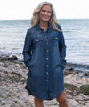 Härlig jeanstunika från Ezence. Tunikan har klassisk skjortmodell med krage, knäppning fram, fickor på bröstet med knappar och långa ärmar med knäppning vid ärmsluten. Tunikan har en lös och skön passform och är något längre baktill.