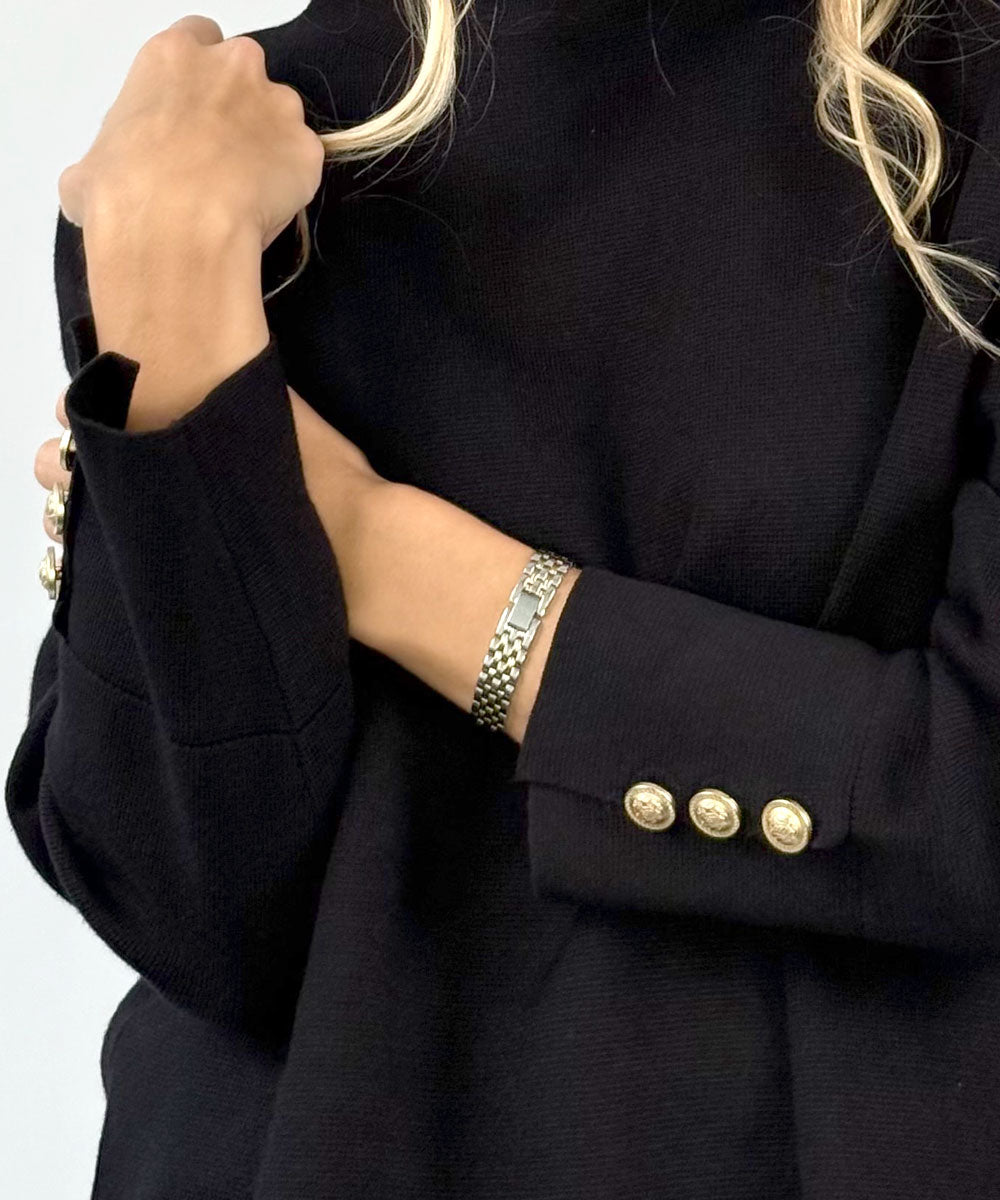 Elma är en härlig stickad tröja från Carla F. Tröjan har en liten krage, hellånga ärmar med guldiga knappar vid ärmsluten och en rak enkel passform.