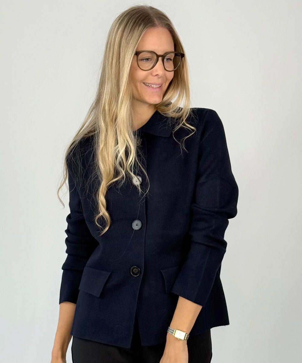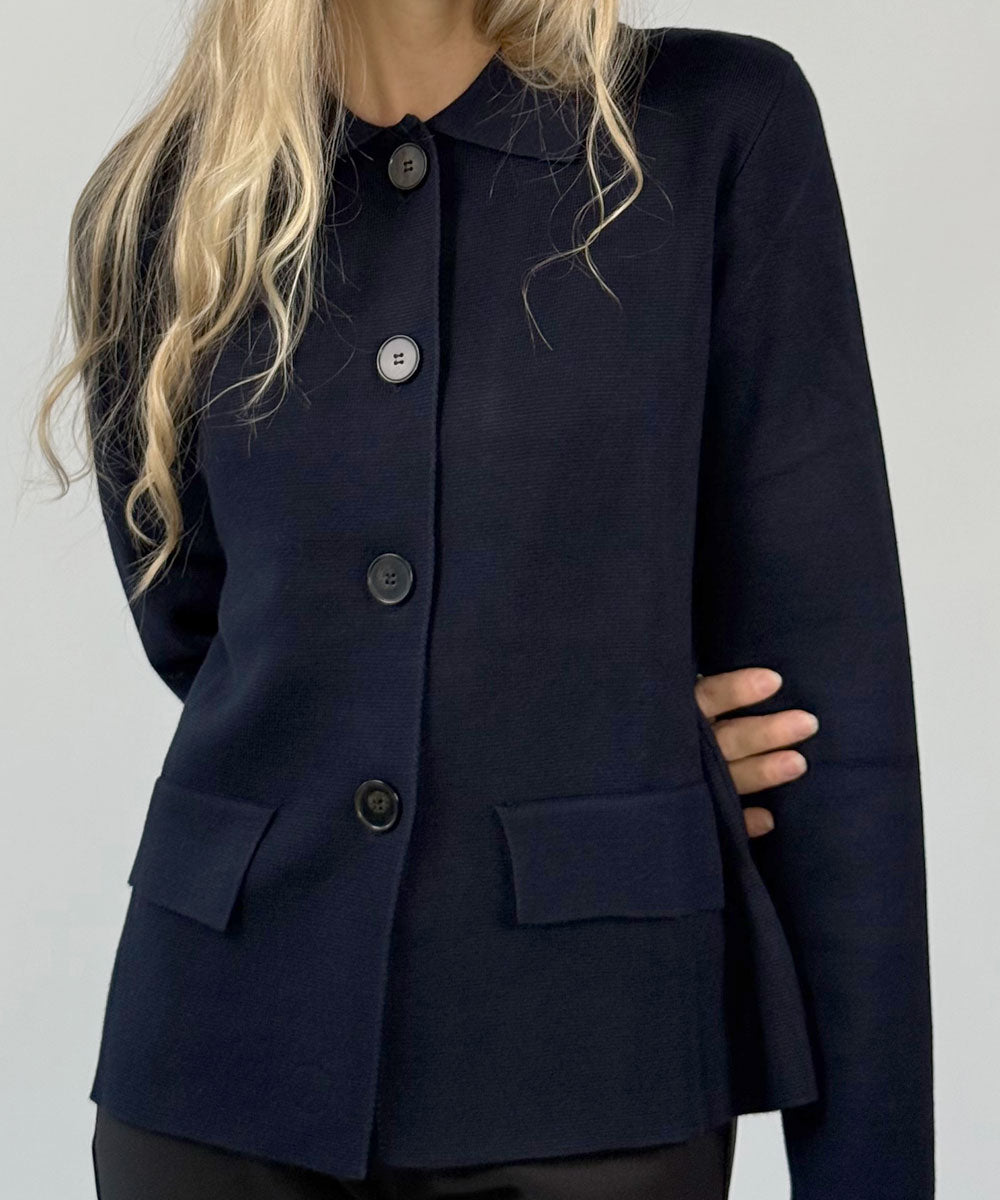 Fia är fin kort cardigan från Ezence. Denna cardigan har krage, knappar fram, fickor framtill, långa ärmar och en normal passform.