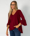 Frida är en härlig finstickad tröja från Ezence. Tröjan har v-ringad hals, 3/4 trumpetärmar och en lätt A-linjesiluett med något längre bakstycke.