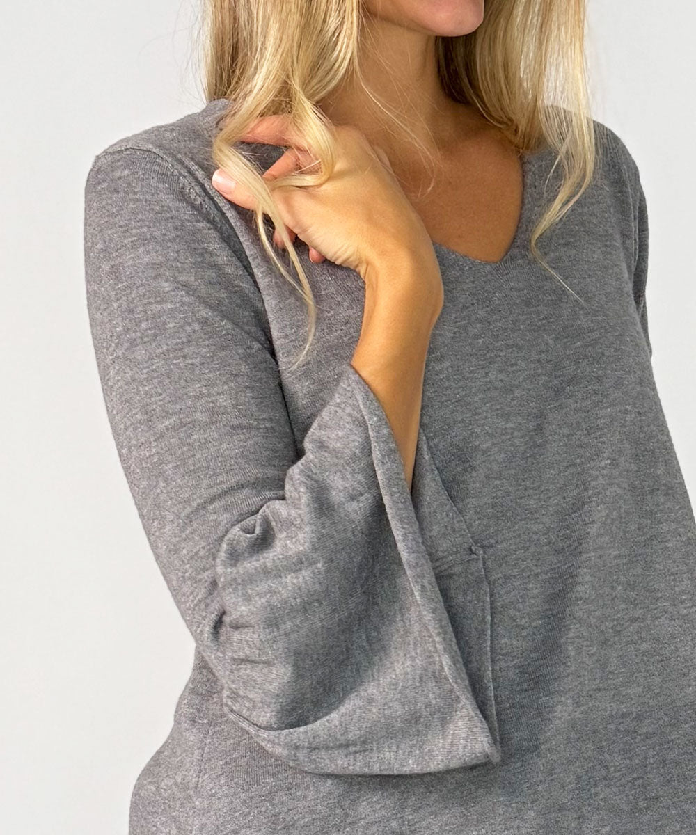 Frida är en härlig finstickad tröja från Ezence. Tröjan har v-ringad hals, 3/4 trumpetärmar och en lätt A-linjesiluett med något längre bakstycke.