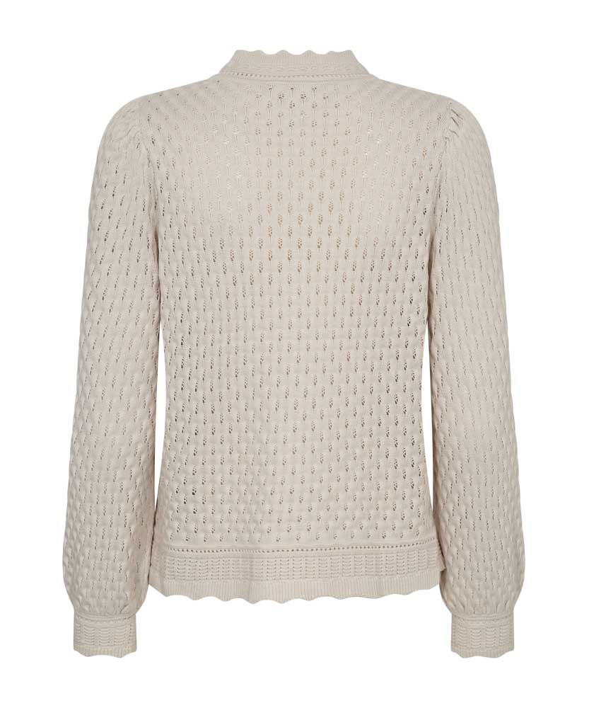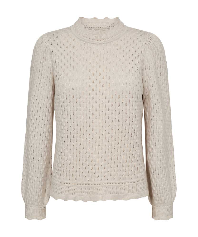 Gina är en härlig tröja från Freequent i ett mjukt, finstickat material med ett elegant mönster. Tröjan har en enkel siluett med rund halsringning med liten volangkant, långa puffärmar och en rak passform