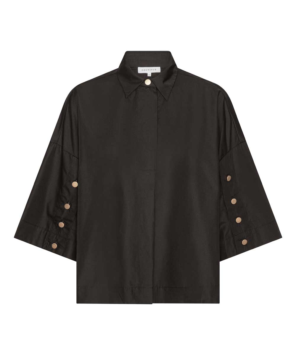 Klara en fin skjorta i cool modell från Continue. Skjortan har en klassisk skjortkrage, 3/4-ärmar med knappar längs sidorna och en skön lös och boxig passform