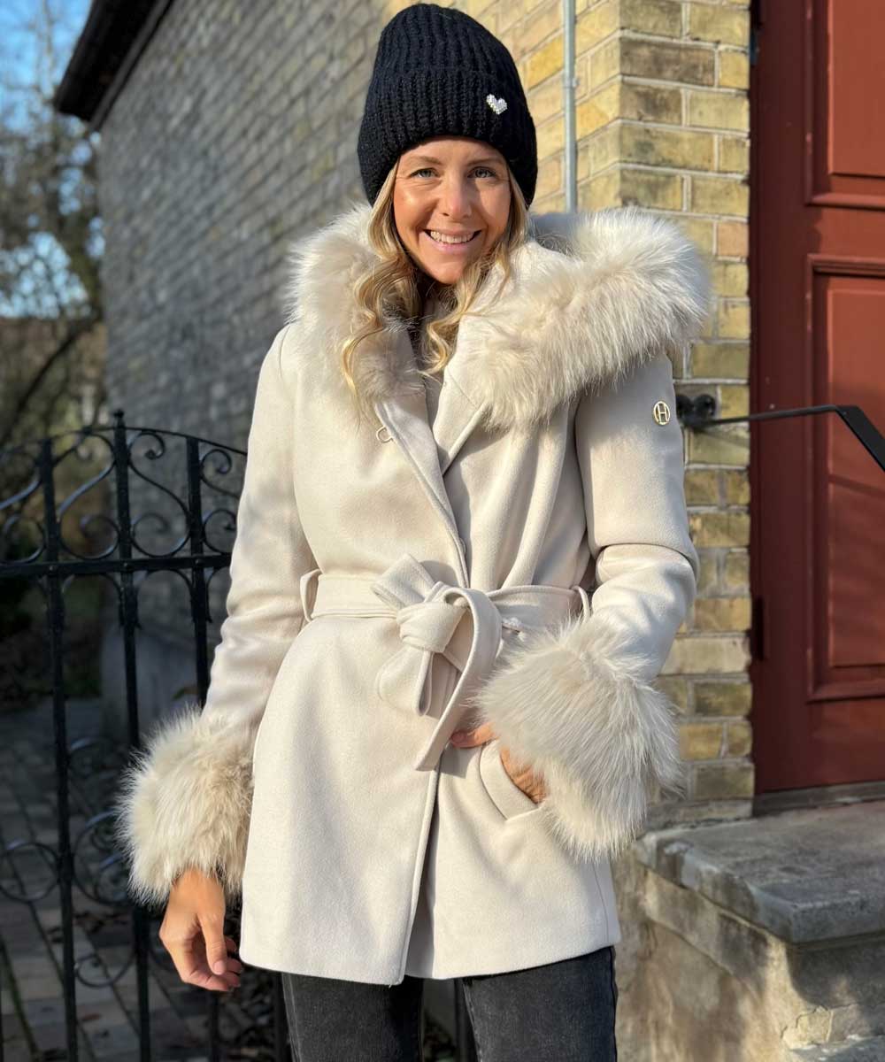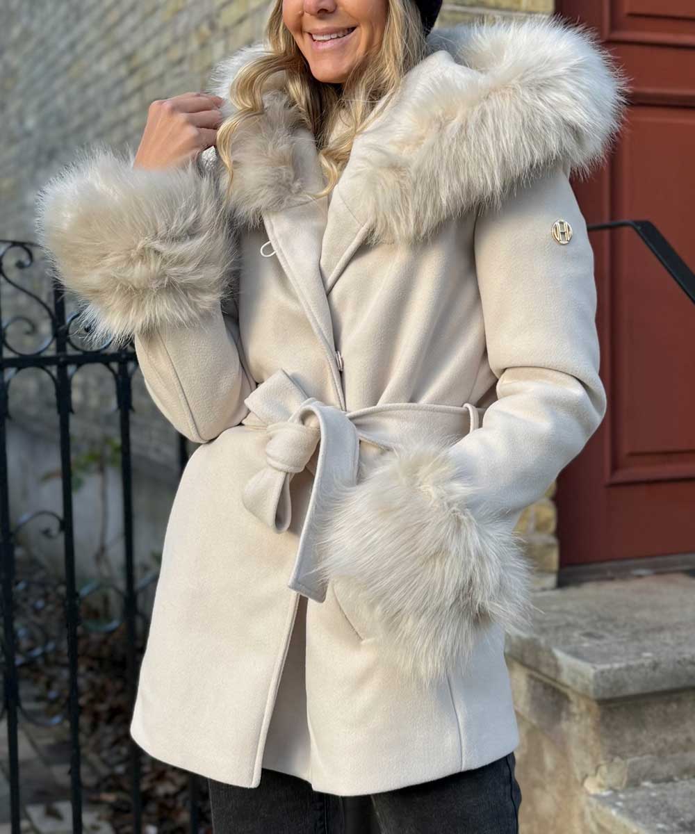 Olivia är en fin kappa från Hollies. Kappan har en rak silhuett, är dubbelknäppt och stängs med en knapp i halsen, avtagbar fuskpäls runt huvan och vid ärmsluten samt ett bälte i midjan som ger en feminin look. Normal i storlek.